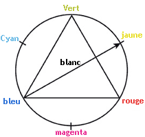 En mélangeant une couleur primaire avec sa complémentaire, nous obtenons du blanc (en projetant une droite sur le cercle entre une couleur primaire et sa complémentaire, la droite passe par le centre qui est le blanc).